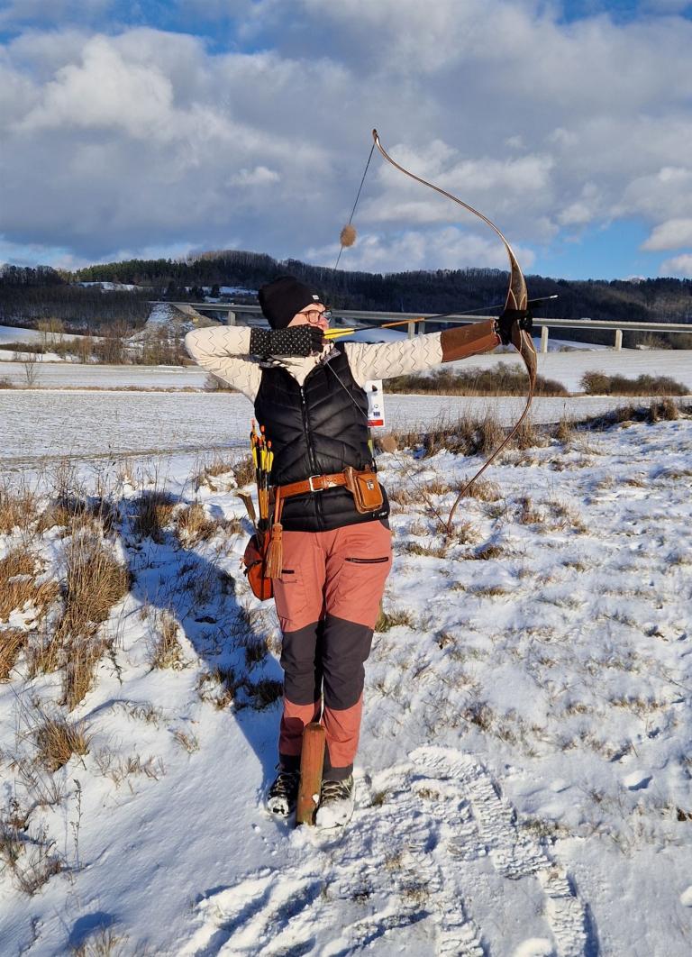 Bogenschießen im Januar: Der Schnee knirscht unter den Schuhen, die Sonne steht hoch und wärmt unsere Gesichter. Unterwegs mit Freunden – es gibt kaum etwas Schöneres.